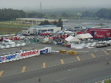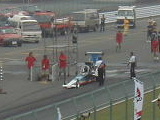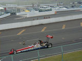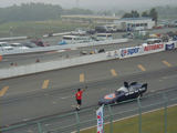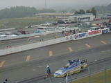 コースの向こう側正面では、TOP FUELのレース準備が、数十人のスタッフで行われています。コース向こう左手側でもファニーカーの出走準備が行われています。